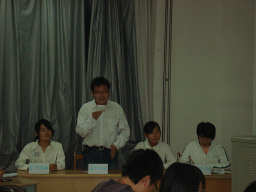会计0702、0703与资产评估的同学分别为正反方。双方辩手围绕“天灾与人祸哪个更可怕”的辩题展开争论。双方开篇明义,划定了自己要论战的领地。特别是他们环环相扣的说理与时事的密切结合给观众及评委留下了深刻印象。在天灾与人祸的可控制性上,正方论证严密,论据充分,找到了他们的评判标准。而反方四辩犀利的语言和充满浓重感情的总结陈辞也让对手及观众为之感叹。