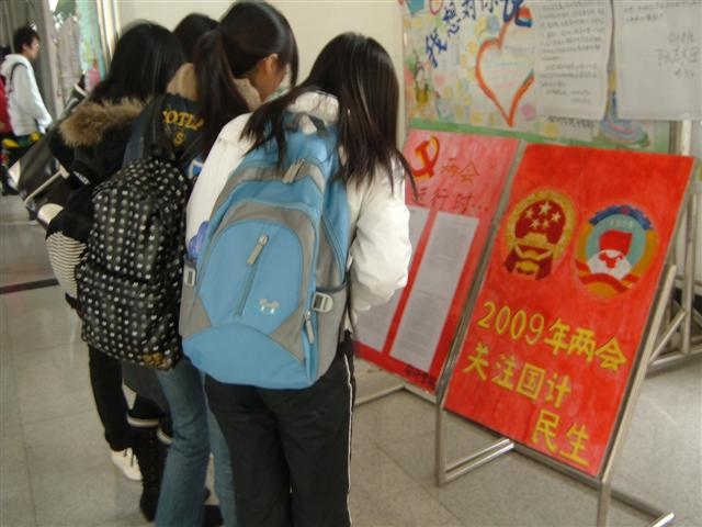 走进明水校区三四号教学楼大厅,两面分别写有“2009年两会关注国计民生”和“两会进行时”的展板特别醒目。记者观察发现,展板主要分两部分,“明日日程”和“昨日回顾”,每天有专门人员负责及时更换。“明日日程”主要介绍第二天“两会”所关注的焦点和议题。“昨日回顾”则用大量材料回顾前一天“两会”的主要内容,如《政府工作报告》摘要。