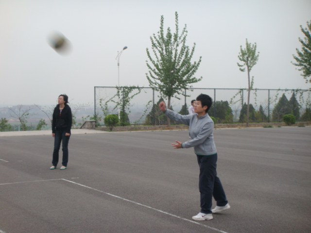 在“跳绳接力”训练场地,老选手正向新选手传授转弯时的技巧,老选手一边示范一遍讲解,新选手则细细地体会着。在“抱球跑”场地中,大家正苦中作乐,让掉球的同学表演节目来舒缓训练压力。在“绑腿跑”场地中,只见两名选手肩并肩、步幅一致“嗖”地一声从我身边飞驰而过,接着又彼此讨论需要改进的地方。在“排球发球”场地中,一名选手直击三分圈,高兴地与队友连连击掌,却忘记了拍得发红的双手的疼痛。而“足球射门”项目则要求选手们发挥稳定,要在15米远的地方把球踢进1米宽的球门,于是选手们只得耐住性子一个个练习。