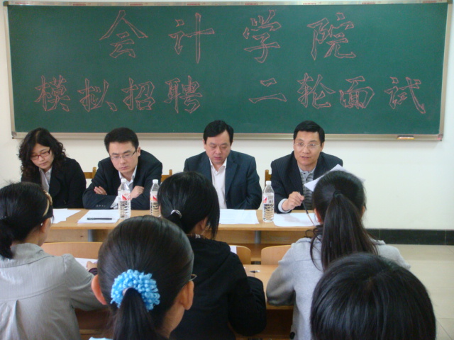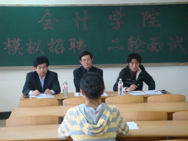 主办的大型模拟招聘会第二轮面试在明水校区3203、3207、教室举行。继首轮面试后脱颖而出的60名同学参加了第二轮面试。这次面试请到了山东省工商银行人事部负责人,山东省工商银行泉茂公司工会主席,新亚商贸公司总经理等来自银行、企业的七名专业人士担任考官。根据同学们的求职意向,此轮面试设有财务会计、注册会计师面试点和银行、企业、公务员面试点。