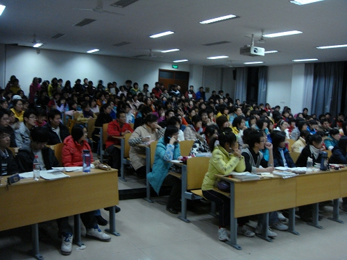 此次讲座邀请了济南新东方英语学校名师团的两名金牌讲师,针对之前进行的四级模拟考试试题进行讲评,并传授冲刺复习经验及应试技巧,整个会场座无虚席。讲座分为三个环节,首先由刘老师细致讲解听力部分的试题,她结合历年真题对高频考点进行归纳,通过英美不同发音、美国俚语等实例教授大家听力的应试技巧,而同学们也结合试卷认真做好笔记;接着由主讲阅读理解的宋老师介绍实用有效的应对技巧,他分别从信息定位、处理信息及迅速准确做题进行了详细阐述,并提醒同学们在最后冲刺阶段要戒骄戒躁,放慢节奏扎实复习。两位老师幽默风趣的语言赢得了同学们阵阵掌声。最后,主持人公布在四级模拟考试中取得优异成绩的前十五名同学名单,并进行了现场颁奖。