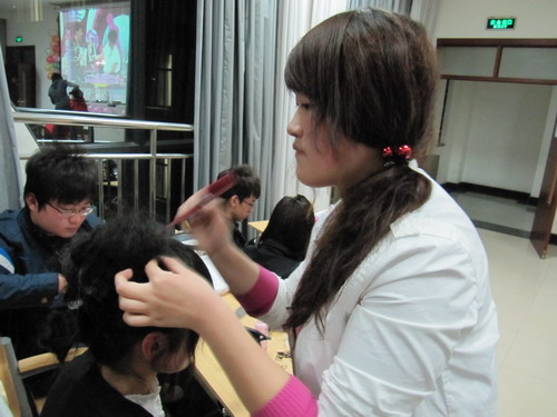 在一阵欢呼声中比赛正式开始,伴随现场欢快的音乐,选手们根据现场随机抽取的主题有条不紊地打造着各自的作品。与此同时,舞台中央进行梨花头的设计表演,精彩的讲解和高超的技艺不时引来同学们的阵阵掌声。40分钟后,选手完成了各自作品,并依次上台进行了展示。其中,清纯可爱、充满活力的粉妆演绎了海边度假,甜蜜约会的主题,高雅的晚装、复古的烟熏妆则营造出时尚盛典的气势。之后,在发型设计的展示中,既有简约干练的职场风格,也有风情婉约的民族风。精彩的表演和专业的展示深深征服了现场的观众。