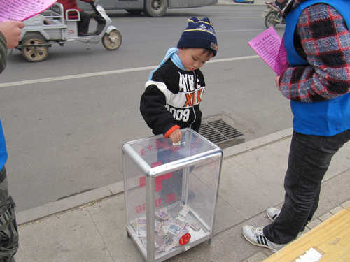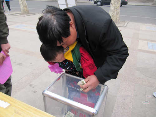 虽然天气阴沉,但同学们的热情丝毫不减。上午九时,60名志愿者准时到达百脉泉广场,布置好主题横幅及展板后,志愿者们分成六组,抱着募捐箱,分别在章丘百脉泉广场及各大超市前开始了募捐活动。头戴红帽子的同学们拿着宣传单,向市民们描述西南旱灾情况,并呼吁市民弘扬中华民族“一方有难,八方支援”的传统美德,伸出援助之手,积极向灾区捐款,支援灾区救灾工作,帮助灾区人民度过生活难关。志愿者率先捐出了自己的零花钱;骑着三轮车的老大爷停下车来,为灾区献出了他的一份爱心;在母亲怀抱里的小朋友,在妈妈的指导下小跑到募捐箱前,希望能帮助灾区的小朋友;还有慷慨解囊的女士更提出可以提供物资捐助。大学生们用实际行动为灾区争取每一份爱心,每一点帮助,唤起了章丘市市民的奉献精神, 市民们踊跃参与,为西南的灾民支起了一个爱的盾牌。