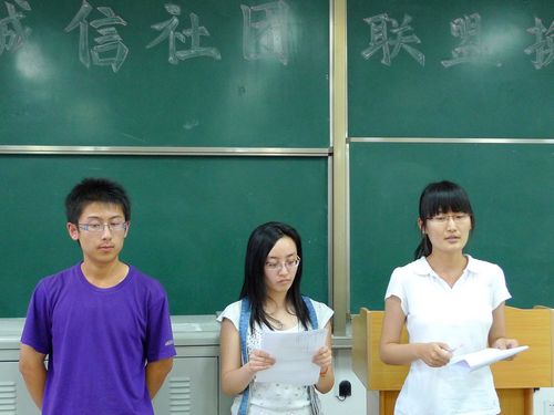 诚信社团联盟明水校区主席骆彦琳、秘书处负责人崔美玉、宣传部负责人田文、外联部负责人陈鹏等担任此次大会评委。本次换届选举大会为期两天,共有秘书处、宣传部和外联部三个部门进行换届选举。