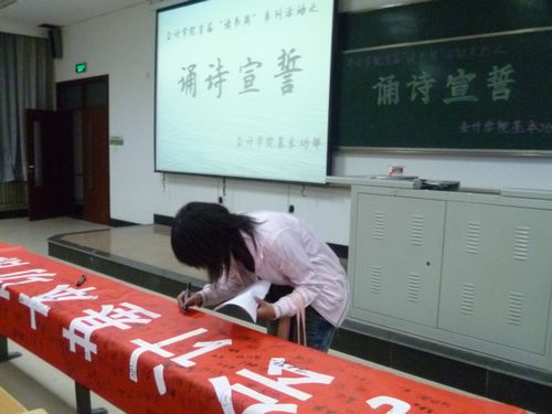 仪式开始之前,参加同学陆续入场,并在预祝活动圆满成功的条幅上签名。仪式正式开始之后,全场同学起立,在主持人的带领下进行了“诵诗宣誓”。誓词内容节选自梁启超的《少年中国说》,恰当地表达出活动的目的,强调了年轻人读书的重要性。随后,同学们一起观看了改编自余华同名小说的电影《活着》。活动过程中,每位到场同学都得到了一份书单,上面印有由基本功部成员精心挑选并予以推荐的书目。