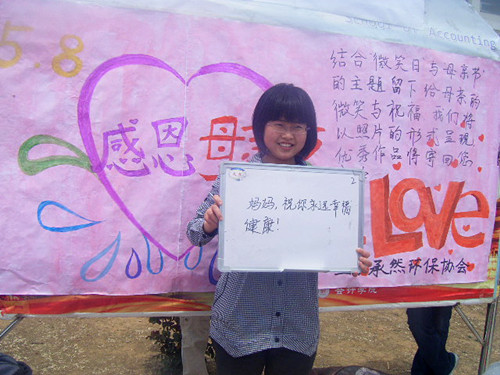 “母亲”本是个平凡的词语,但母亲永远是平凡中见伟大的人物。她赐予我们生命,含辛茹苦将我们抚育成人。斑白了黑发,燃尽了青春。5月8日,又到了一年一度的母亲节。我院承然环保协会特别推出感恩母亲节活动,希望可以借此为大家提供一个向母亲说出我们心中之爱的平台。活动参加方式很简单,同学们只需在留言板上写下想对母亲说的话,并与留言板合照留影即可。温馨的展板吸引了来往同学,大家纷纷拿起笔,写下埋藏已久的心里话。有质朴的“妈妈您辛苦了,节日快乐”;也有浪漫的“您是一棵大树,春天倚着您幻想,夏天倚着您繁茂,秋天倚着您成熟,东西倚着您沉思,我爱你妈妈”;更有诙谐的“我若是大款,您就是大款的妈妈;我若是总统,您就是总统的妈妈。不管将来儿子是什么,我都永远爱您。”一个小小的留言板,写不尽大家对妈妈千言万语的感恩与思念。据悉,此次活动将持续两天,5月7日下午,由承然环保协会成员评出30份优秀作品。获奖作品,协会将免费为大家邮寄回家。