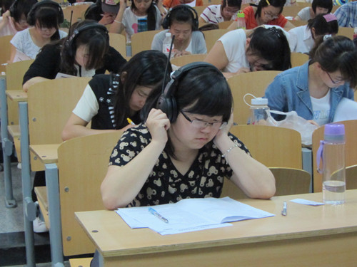 六点整,六级模拟考试首先举行,半小时后,四级模拟考试也拉开了序幕。虽然只是一次考前练兵,同学们依然认真对待,抓住每一次可以训练自己的机会。考试首先进行的是作文部分,只见同学们奋笔疾书,绞尽脑汁,将自己所学的知识应用到实战当中;客观题部分中,同学们更是小心谨慎地做每一道题,认真的检查,直到最后交卷。同时我们看到,六级的考场上,同学们答题比较轻松,每个人都是胸有成竹的样子;四级考场上,大一的同学们就比较紧张,对考试的题目和考试时间把握的不是很充分。整场考试秩序井然,气氛严肃,为同学们提供了一个全真的考试环境。