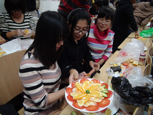 此次活动共分为三个环节,分别是自备食材做参赛作品、各小组才艺展示和现场即兴创作。活动伊始,由开场嘉宾带来的架子鼓表演和歌曲点燃了全场欢快热烈的氛围。紧接着,进入第一轮比赛:各参赛小组在限定的时间内制作自己的作品,比赛期间亲友团不得帮忙。在此期间,主持人带领观众进行了“50秒不NG”小游戏和百科知识问答,缓解了现场紧张的气氛。二十分钟后,各小组将自己的作品展现给观众和评委。在众多作品中,既有水果拼盘“心心相印”、“爱屋”、“花样年华”,又有“可乐寿司”、“加利福尼亚小三明治”等点心。一些作品在造型上别出心裁、各具特色,味道独特可口,获得评委和观众的好评。随后,在小组才艺展示环节,各小组倾情表演,深情的歌曲演艺,酷帅的双节棍表演赢得现场阵阵掌声。最后的环节中,各小组按照前两轮成绩由高到低,依次从黑袋中选择一份食材,现场制作。选手们集思广益,尽情发挥想像,将自己的创作天赋展示给评委和观众。
