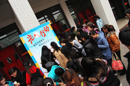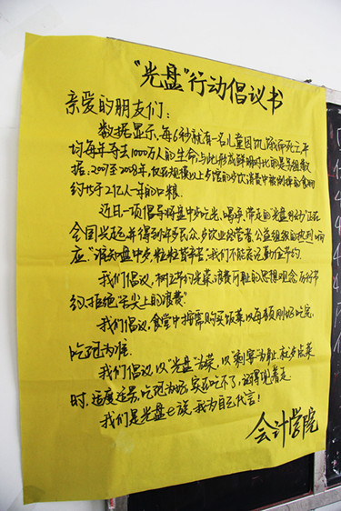 在食堂门口,宣传部早已制作好了宣传横幅和寓意环保节约的“宣传树”,同学们纷纷蘸着七色油彩将自己的指印按在树上,寓意点滴善举可以聚合成强大的正能量,尽自己微薄之力让环保之树开满七彩花朵;在食堂内,我院同样发起倡议,希望同学们从这餐饭做起,将盘中餐吃干净,并晒出“光盘”照片,让节约成为大学里最热门的生活准则;而同学们制作的“光盘”视频,同样在网络上如火如荼的传播着……如倡议书所言,谁知盘中餐,粒粒皆辛苦。我们不能忘记勤俭节约的传统美德。