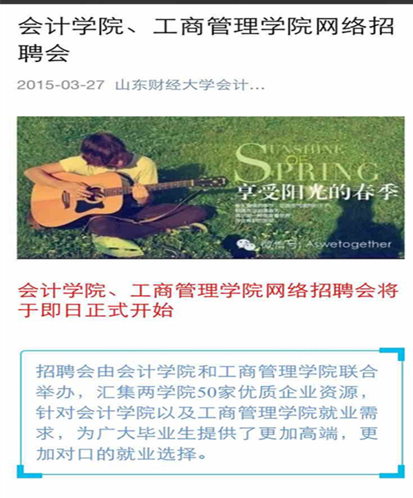 就业信息发布微信平台:“山东财经大学会计学缘”(微信号“Aswetogether”)、“商院就业办”(微信号“scdgsjyb”),热烈欢迎广大同学积极关注。
