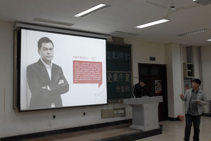 晚六点半,分享会在免费午餐宣传片的播放中准时开始。首先,2014级星火志愿者协会负责人马煜杰发表讲话。在讲话中,他汇报了有关免费午餐活动的情况:截止到此次分享会开始之前,已共筹集到1520.2元钱,大约能为500名贫困山区的孩子提供午餐。同时,他对所有为本次活动尽力筹备、尽心宣传的工作人员和热心捐款的同学表示了衷心的感谢。随后,张珺雷向大家进一步介绍了免费午餐活动的创始、概况和执行方法。他介绍道,免费午餐是由邓飞等500多名记者和国内数十家主流媒体联合中国社会福利基金会发起的免费午餐基金公募计划,它吸引众多爱心人士共同致力于帮助那些因家庭贫困而无法享受营养午餐的学生。随后他讲述了自己大一到云南支教的经历,正是这次珍贵的支教经历使他感受到,每个志愿者都是一滴水,但汇聚起来便是一条河,甚至一片海。他呼吁大家,只要每个人都能用爱心包围温暖,去一点一滴地积攒,这份免费午餐便会得到持续的传递,公益与爱的力量终会得到最美的绽放。最后,张珺雷向大家分享了“趋光计划”。在简单介绍趋光游学筹备组成员后,他热情分享了自己从北京到天津的徒步游学经历,并鼓励广大同学积极参与“趋光计划”、“寻光之旅”,从中体会坚持与互助,学到课堂以外的种种,找到真正的自我,唱出属于自己的主旋律。