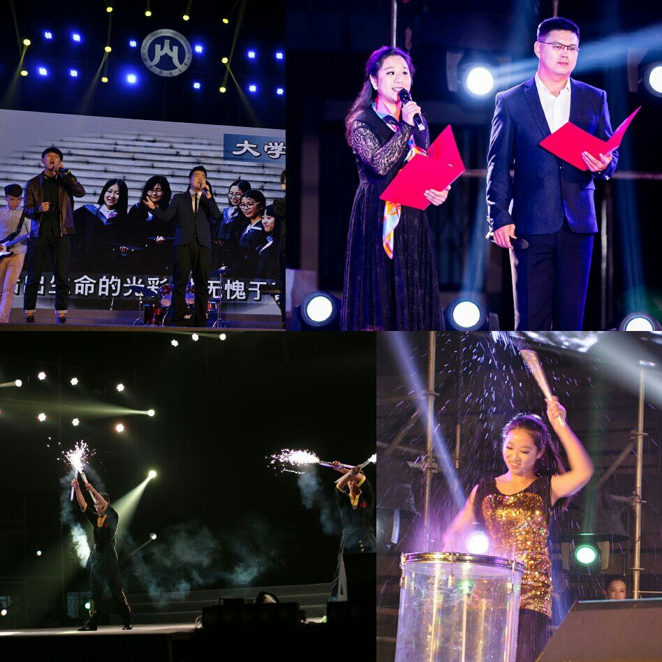 晚上七点整,在精彩的开场视频之后,迎新晚会正式开始。天空中繁星闪烁,现场同学激情澎湃,他们手持荧光棒,点点摇曳的光在偌大的操场上闪闪发亮。开场鼓乐表演《鼓舞财大》富有气势,激情澎湃。第一篇章“大学”中,舞蹈《莲颂》画风清新,一股古典美跃然纸上。第二篇章“青春”,各民族的同学为我们献上民族歌舞串烧,诠释了山财大的大团结,精彩绝伦的民族歌舞使全场沸腾。朗诵广播剧《钢铁》节选名著《钢铁是怎样炼成的》中的三段经典情节,生动又悲壮地再现了保尔对革命一生的忠诚付出,以及与初恋冬妮娅错失的爱情,两位演员的表演得到全场的好评。校园歌舞《律动青春》好戏连台,形式新颖的荧光舞,悦耳动听的英文歌,活力四射的啦啦操,引发一阵又一阵的欢呼;财大版《南山南》将歌词改编,献给母校一首最浪漫的情歌;歌曲《逆战》火力全开,调动了全体同学的热情。伴随着熟悉的旋律,晚会进入最后一个篇章“追寻”——《十送红军》、《红军不怕远征难》两首红歌深情感人,情景朗诵《井冈山我们来了》动人心弦,引领同学们穿越过时间的滚滚洪流,回到那个抛头颅洒热血的红色年代,《追寻》则唱出了对祖国最深沉的爱恋。最后,晚会以歌曲《天耀中华》作为尾声,全体演员上台谢幕,晚会圆满落幕。