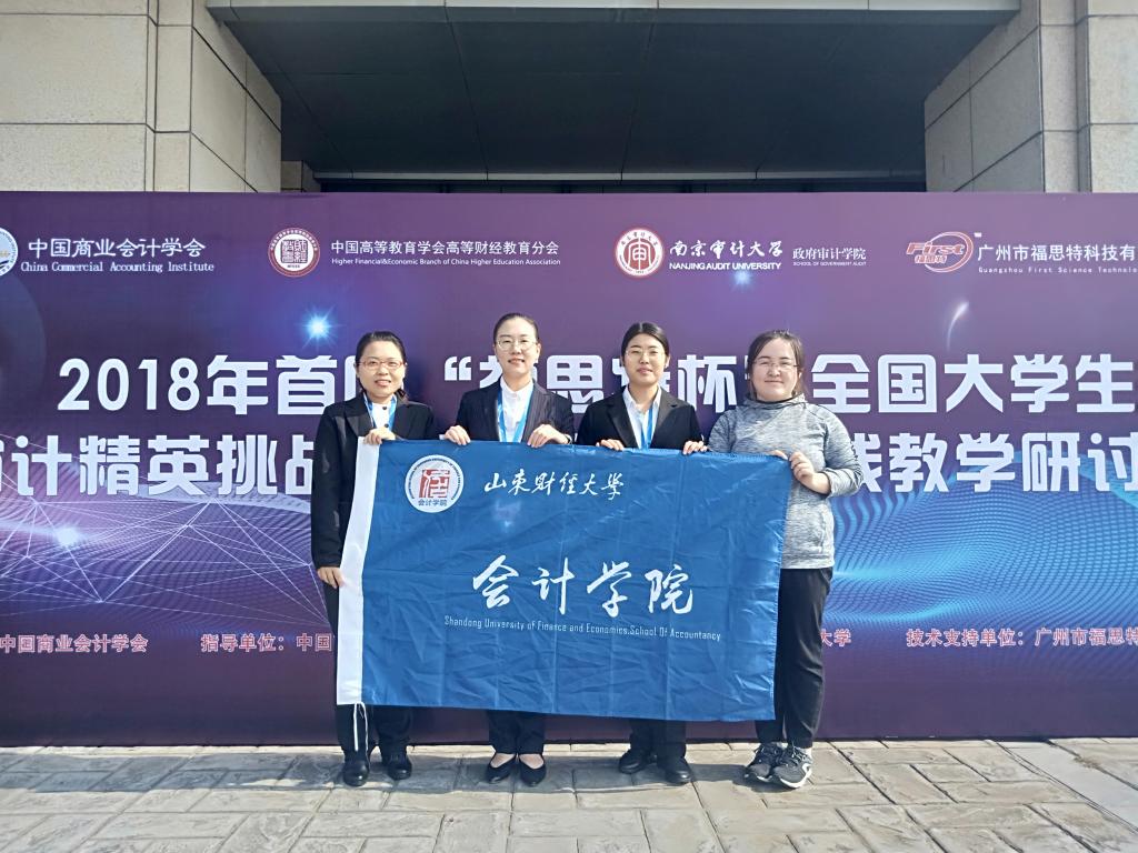 2018年11月10日,首届“福思特”杯全国大学生审计精英挑战赛在南京审计大学隆重举办,由我院会计1502班吕燕、审计1501班李君燕、审计1504班于佳丽三位同学组成的山东财经大学代表队在指导老师石贵泉老师、领队王文伟老师的指导协助下以过硬的专业基础、稳定的现场发挥、突出的临场表现,一路过关斩将,最终荣获一等奖,为我校争得了荣誉,也进一步扩大了我校在全国审计教学领域的专业影响。