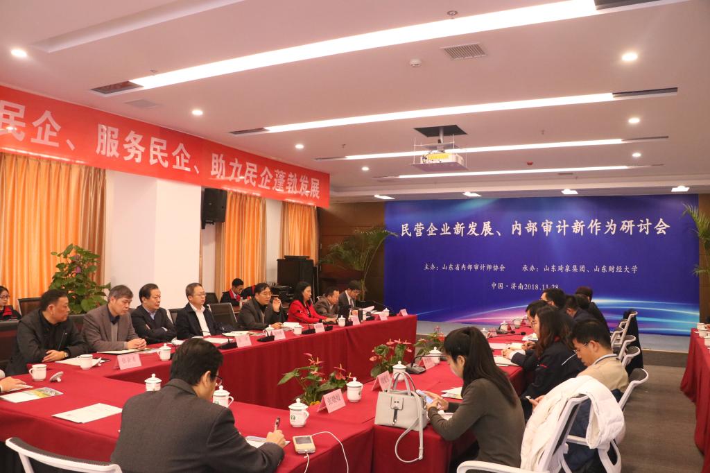 11 月 28 日由山东省内部审计师协会主办、我院与山东琦泉集团共同承办的“民营企业新发展、内部审计新作为”研讨会在琦泉集团总部 21 楼多功能会议厅成功举办。山东省内部审计师协会会长陈朝豹,山东省审计厅内部审计指导中心主任温国栋,济南市审计局副巡视员沈鲁,山东财经大学研究生院院长毕秀玲、国外足球预测网站 党委书记张涛、副教授石贵泉,琦泉集团董事长董统玺,中国微金融·证券法律研究中心主任喻胜云,山东众成清泰律师事务所主任唐向东以及驻济金融机构、企事业单位代表、新闻媒体编辑记者共同参加了活动。