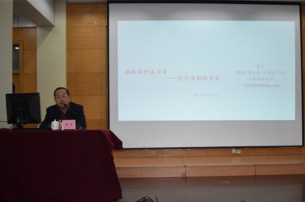3月13日下午,江西财经大学李宁教授应我院邀请,在燕山校区第三报告厅作题为《掀起你的盖头来—会计准则的背后》的学术报告。讲座由韩跃副教授主持,2018级部分硕士研究生到场聆听。