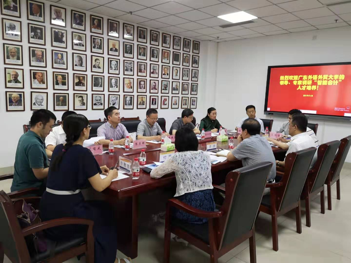 7月10日下午,广东外语外贸大学国外足球预测网站 院长余鹏翼、规划处处长陈彦辉、资产处处长吴民、教务处副处长董俊武、网络与信息化中心副主行陈平仲、党委副书记杜焕君、国外足球预测网站 教师刘星河一行7人来到国外足球预测网站 ,调研国外足球预测网站 在“会计学(智能会计方向)”专业人才培养以及智能会计实验室建设经验。会议由国外足球预测网站 党委书记张涛主持,国外足球预测网站 副院长王守海、党委副书记付亚、会计信息化系主任牛艳芳参加。
