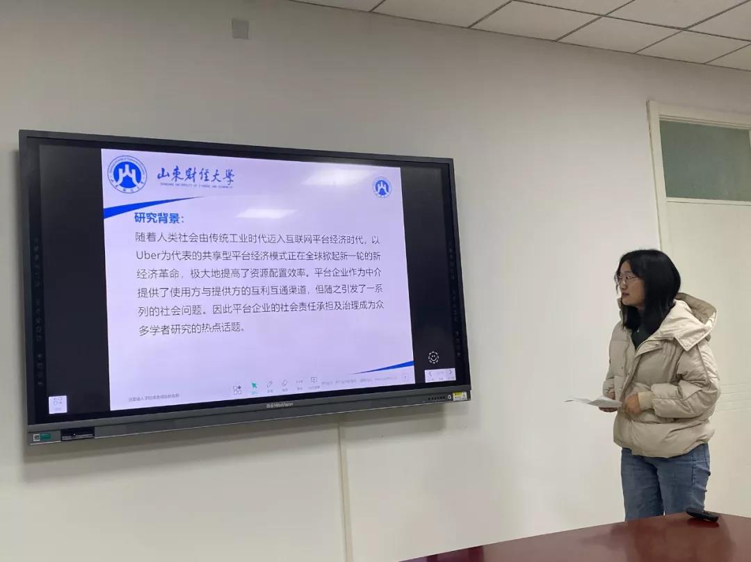 第四组成员包括王燕文、李春苗两位同学,并由李春苗同学对《平台型企业的社会责任治理》进行报告。该报告从概念界定、研究背景、研究目的、研究贡献、相关理论、研究框架几个方面进行介绍。张志红老师指出,研究方向很好,并建议可以从某一个企业研究社会责任某一方面。