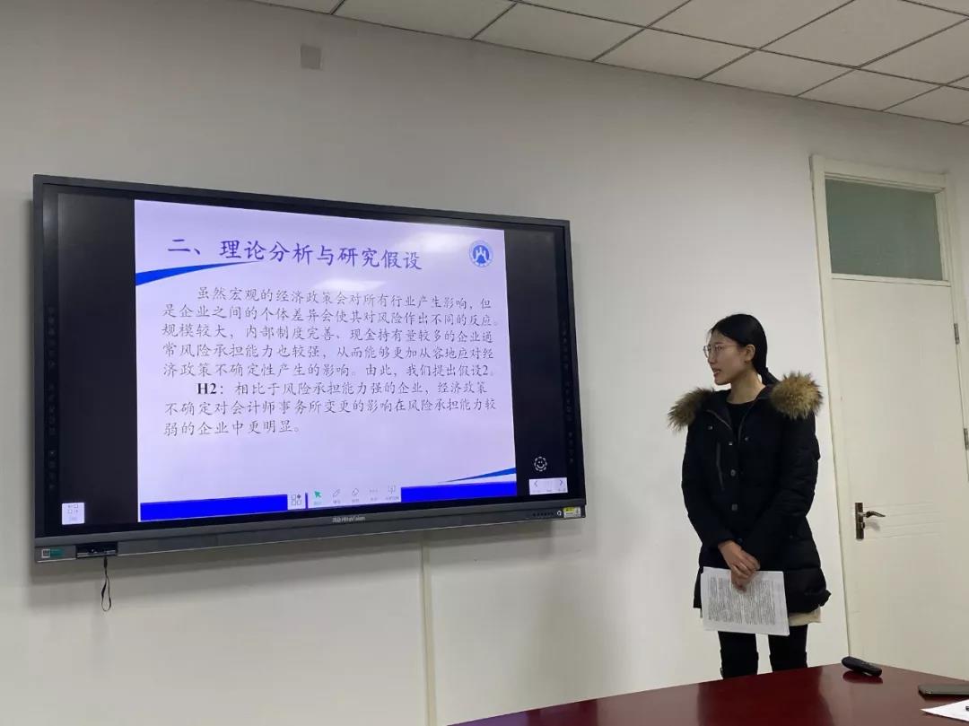 第三组成员包括李君燕、栗雅楠两位同学,并由李君燕同学对《会计估计的可审计性》进行报告。该报告从研究背景、参考文献、研究问题、相关理论、研究创新以及进一步研究几个方面进行介绍。韩冬梅老师指出,题目过大,数据搜集存在难度,并且建议根据研究设计进行推导找到相关理论。