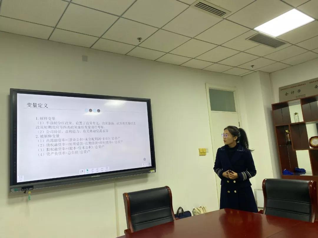 第二组由刘艳同学对《半强制分红政策背景下的融资结构分析》进行报告。该报告对研究问题、相关文献、研究动机、研究贡献、核心思想、研究数据、变量定义进行介绍。王俊韡老师建议,要理清半强制与融资结构的因果关系,并考虑其他因素对融资结构的影响。