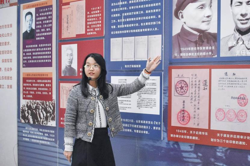 机关党委干部刘映宏详细介绍了山东审计的发展史,带领老师与同学们参观了山东根据地审计工作图片展,讲述了山东审计的红色根脉及其在根据地时期承担的历史使命,通过观看山东审计发展与“审计人”陈科的专题纪录片,加深了现场师生对审计工作的理解与认同,深植了同学们作为一名“审计人”的担当与情怀。