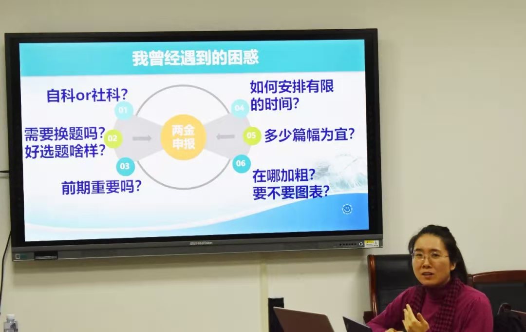 然后,韩冬梅副教授和王斌副教授分享了自己申报成功的经验。韩冬梅副教授从十个环节对项目申请书进行了详细的经验分享,分别是学科选择、选题、立项依据、研究内容、研究目标、拟解决的关键科学问题、研究方案、本项目的特色与创新之处、研究计划及预期成果和工作基础。韩老师提到,成功的把握在于积累和准备,要积累研究成果,凝练科学问题;强调“三人行,必有我师”,青年教师要广泛交流,积极接受建议。王斌副教授介绍了自己几年的申报经历,以此鼓励大家不要轻易放弃。她建议大家要反复打磨自己的选题和申请书,如果没有通过国家自然科学项目,也不要灰心,要虚心接受并且重视评审人的反馈意见,针对每一条反馈意见做进一步的修改。