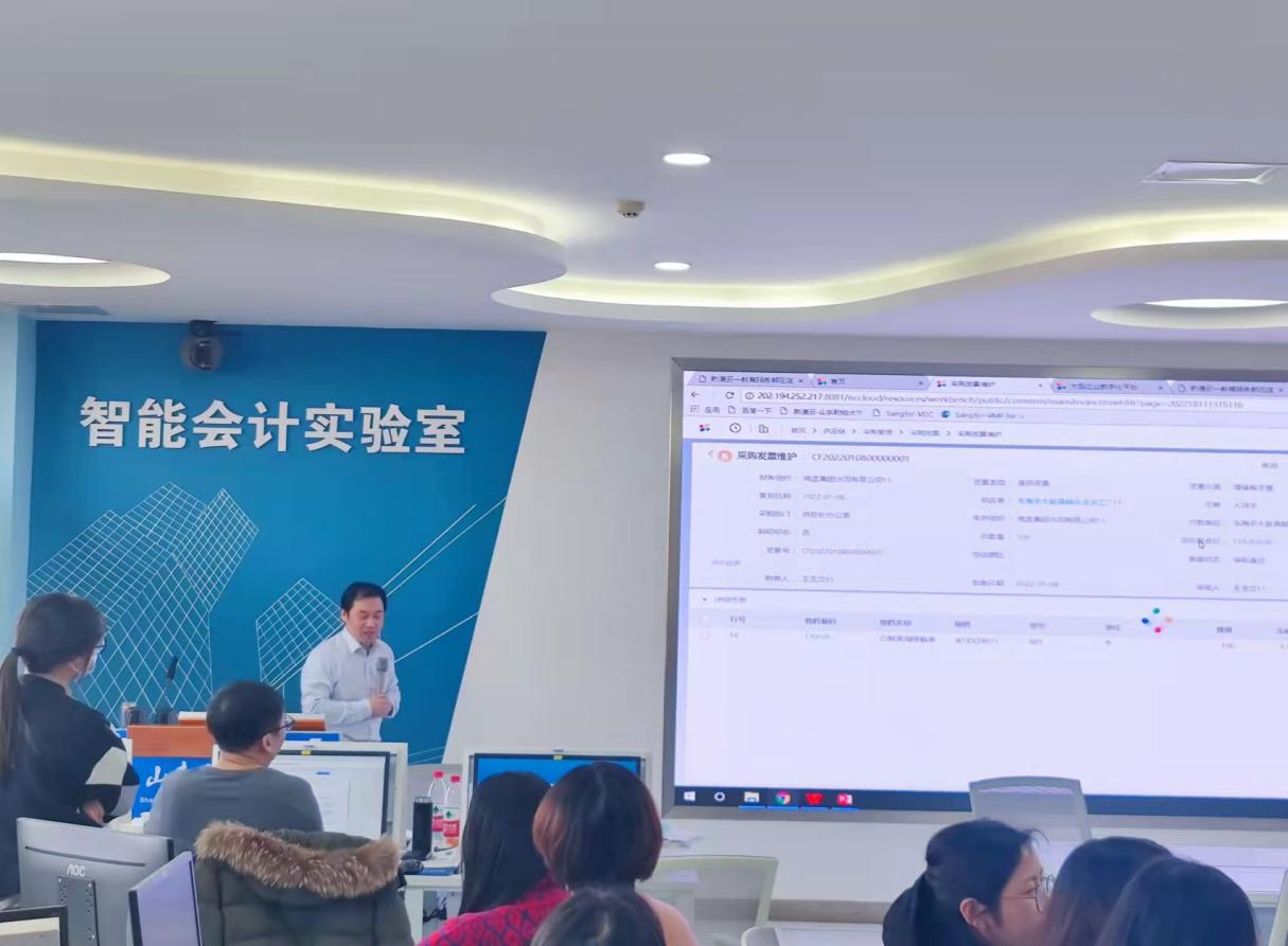 按照培训课程安排,宋国荣在7日和8日上午对《智能财务共享》课程做了详细讲解。在近一天半的培训过程中,他首先介绍该课程的教学目标、教学设计、教学过程与配套实验平台。进而结合教材内容体系,阐述了财务共享服务的发展历程和框架体系,以及财务共享服务中心的规划、设计、建设和运营。并以费用报销和采购付款为主要案例,介绍教学案例如何实现财务共享的流程设计和应用,指出了课程教学中对教师的要求,学生易出现的问题和解决策略。