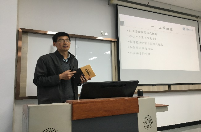 首先,吴大新以亚当·斯密的时代课题为开题,进一步阐释了《国富论》与《道德情操论》、伦理学与修身书的辩证关系;其次,吴大新从《道德情操论》的理论结构、亚当·斯密的主要贡献、本书的启示三个方面进行了解读;最后,吴大新推荐了几本经典著作,鼓励大家学术之余多读好书,温故知新。同学们围绕吴大新教授的讲解积极展开讨论,更进一步理解了为什么亚当·斯密被称为“社会科学领域的牛顿”、为什么《国富论》是《道德情操论》基本原理在经济领域的应用,以及“盖伦理学者,知识之径涂,而修身书者,则行为之标准也”的深刻含义。