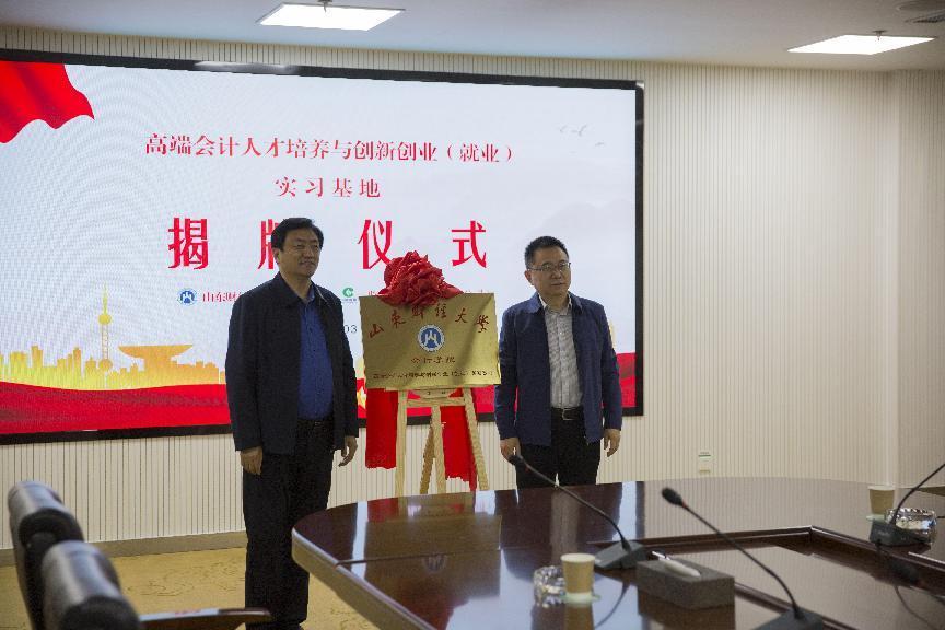 临沂市烟草专卖局(公司)党委委员、副局长关军、国外足球预测网站 党委书记邵文涛为高端会计人才培养与创新创业(就业)实习基地揭牌
