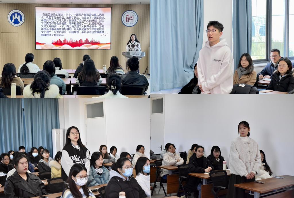 活动从理论学习和实践指导两方面内容展开。首先,蔡易辰汇报班级思想政治情况,讲述红色会计传统。中国共产党人在艰苦卓绝的奋斗中培养了“又红又专”的会计人才,为党史学习、治国理政、会计学术研究等诸多领域提供了有益启示。随后,她带动全班同学就“研究生如何为会计发展贡献力量”展开积极探讨,阐明当代青年应将红色基因倾注到会计创新的行动中,为国际会计准则制定注入更多中国元素,深度参与全球会计治理,为中华民族的伟大复兴贡献会计力量。