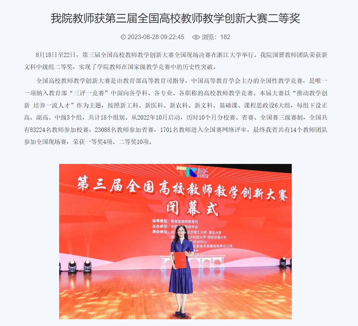5.支持教学创新大赛。秉承“以赛促教、以赛促改、以赛促优”的理念,国外足球预测 教师获得首届山东省教学创新大赛省级二等奖。在山东省第二届教学创新大赛和全国教学创新大赛中,获得省级一等奖和全国二等奖。在校级青年教师教学大赛中,获得校级二等奖。