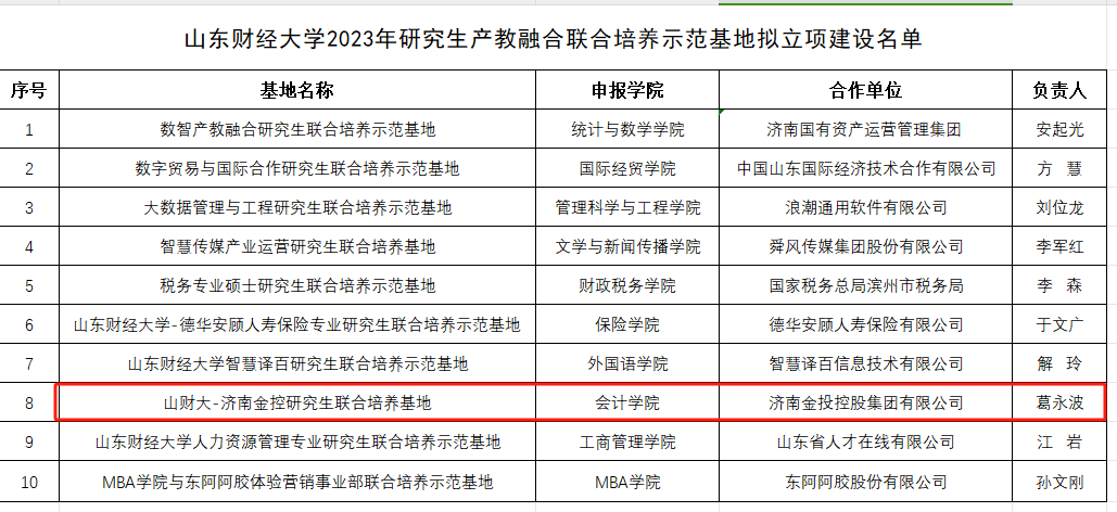 3.深入推进产教科教融合,强化资源共享和协同发展,提升研究生培养质量。山财大-济南金控研究生联合培养基地被评为学校研究生产教融合联合培养示范基地,成为全国智慧财经行业产教融合共同体理事长单位。