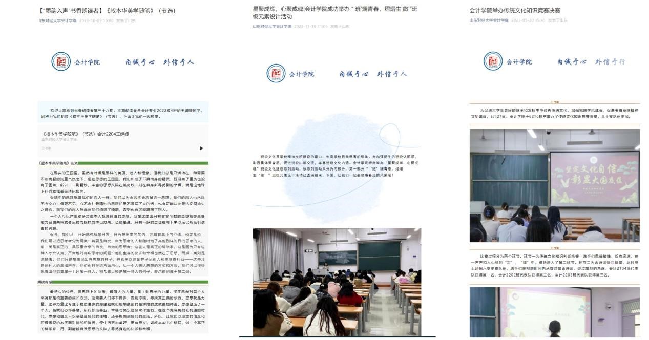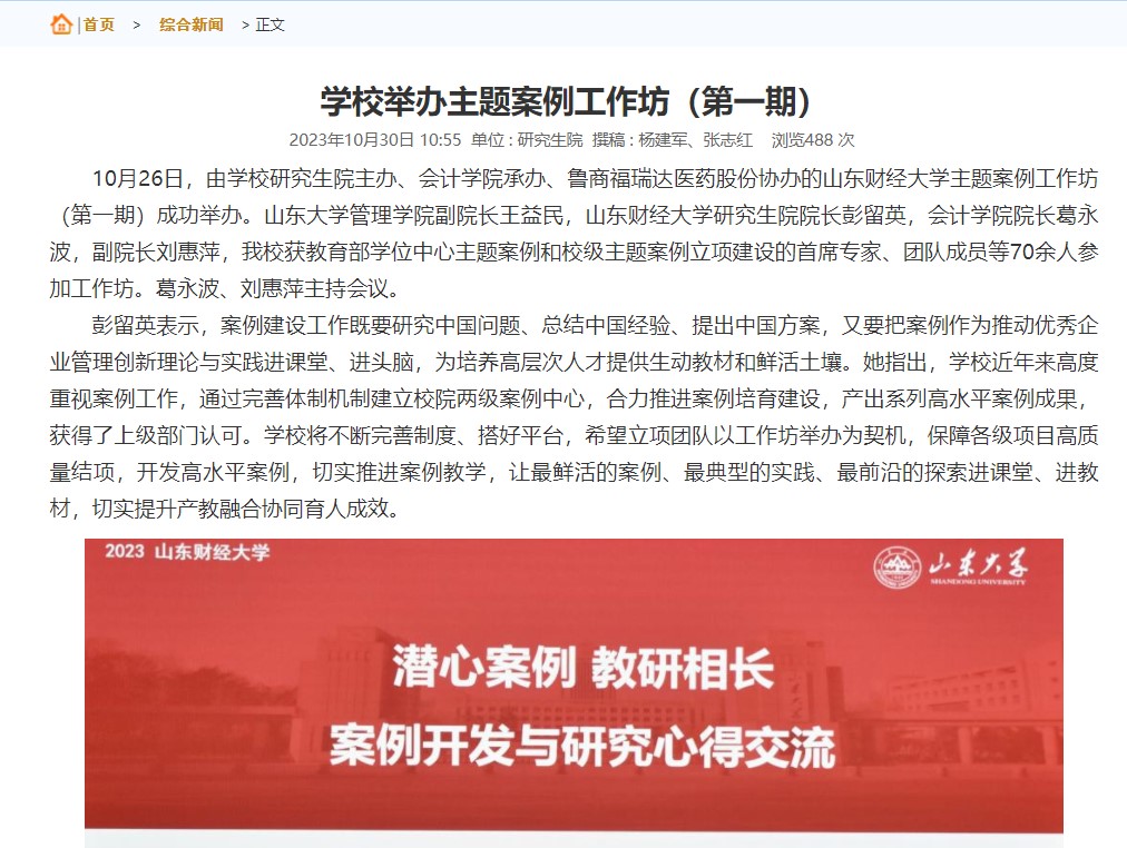 2.推进人才分类培养,强化学硕学术能力和专硕实践能力培养。承办了“经科杯”山东财经大学第八届研究生学术节创新论坛管理分论坛、山东财经大学主题案例工作坊(第一期)培训研讨会,成功举办中国MPAcc案例比赛校级第四届比赛,举办了10期MPAcc大讲堂,吸引参与人员600余人次;MPAcc主办“明湖论道”第六期“有智者事竟成,业财融合实践性——走进鲁商福瑞达”活动,MPAcc中心联合山东财经大学临沂金融研究院组织了“感悟沂蒙精神、传承红色基因”红色教育与素质拓展活动。