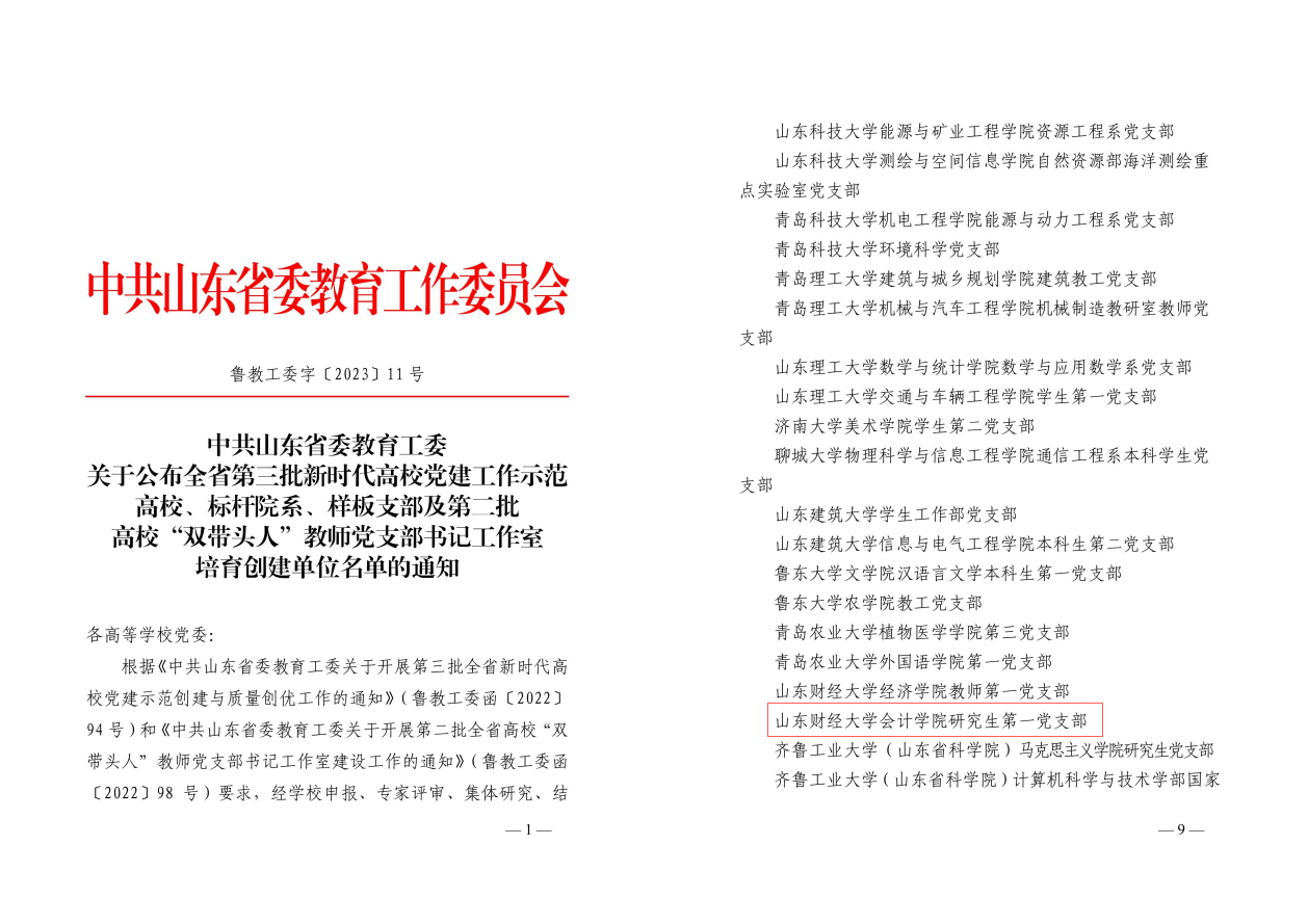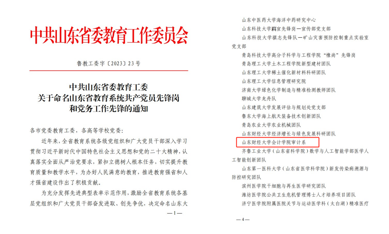 1.发挥党建引领作用。增强基层党组织政治功能和组织功能,持续推进红色会计的挖掘和研究,打造红色会计“特色党建品牌”;2023年8月,国外足球预测网站 研究生第一党支部获批山东省第三批新时代高校党建工作样板支部培育创建单位,10月国外足球预测网站 审计系获评山东省教育系统共产党员先锋岗。