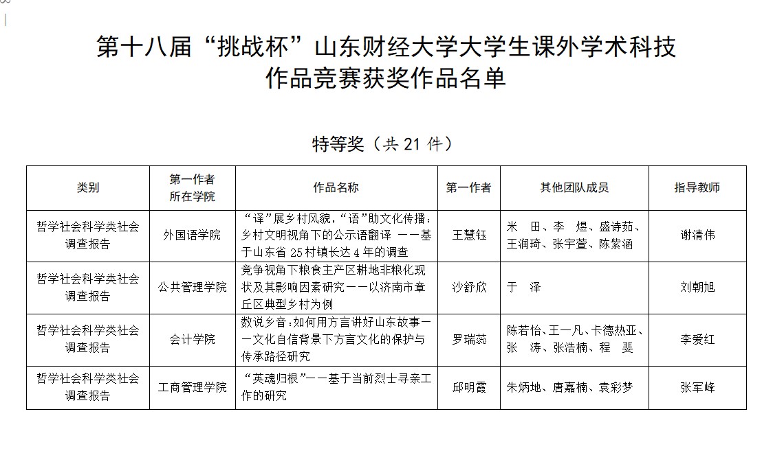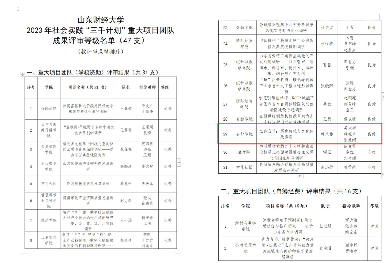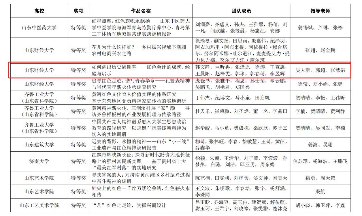 5.传承红色会计,培育时代新人。国外足球预测网站 井冈山精神志愿宣讲团入选由团中央组织的“全国千支大学生志愿宣讲团”。“山东省红色会计文化遗产的发掘、整理、保护与传承调研团队”和“山东财经大学红色会计——历史价值与文化传承调研团队”2个重大立项调研团队,指导教师带领国外足球预测 120余名学生进行实地调研,找寻红色印记,发掘和传承“红色会计”历史文化遗产。《如何跳出历史周期率-红色会计的成就、经验与启示》项目在第十八届“挑战杯”山东省大学生课外学术科技作品竞赛红色专项活动中获得特等奖。