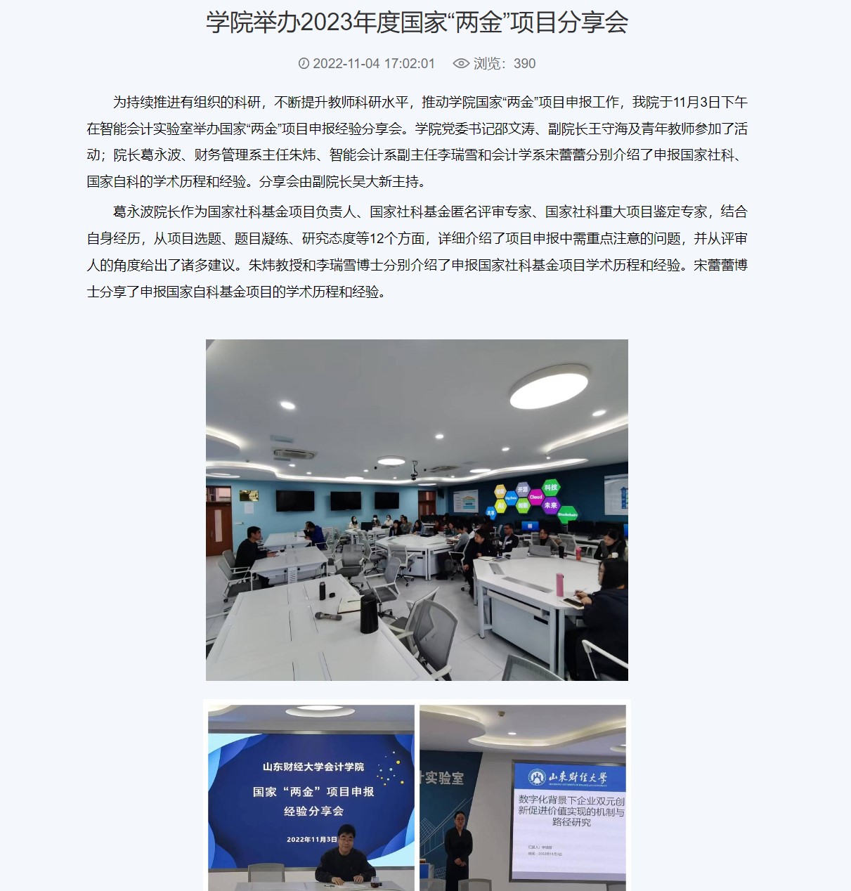 举办多场高水平学术讲座。开设“名人·名家”大讲堂,举办4期“学术沙龙”。承办三个国家级学术会议;6月3-4日,中国商业会计学会智能会计分会成立大会暨第一届“智能会计与数字企业”学术年会顺利举办,中国商业会计学会智能会计分会成立;10月7日由国外足球预测网站 - 欧洲足球预测网 与西南财经大学中国政府审计研究中心共同主办的服务会计审计学科建设、中国政府审计研究中心(CCGAR)走进全国高校行动计划(山东财经大学站)暨CCGAR双周论坛第203期学术研讨会召开;10月30日,中国会计学会会计教育专业委员会与会计信息化专业委员会跨学科联合调研座谈会顺利举办;11月11日,中国会计学会会计史专业委员会第十二届学术年会在山东财经大学成功举办。