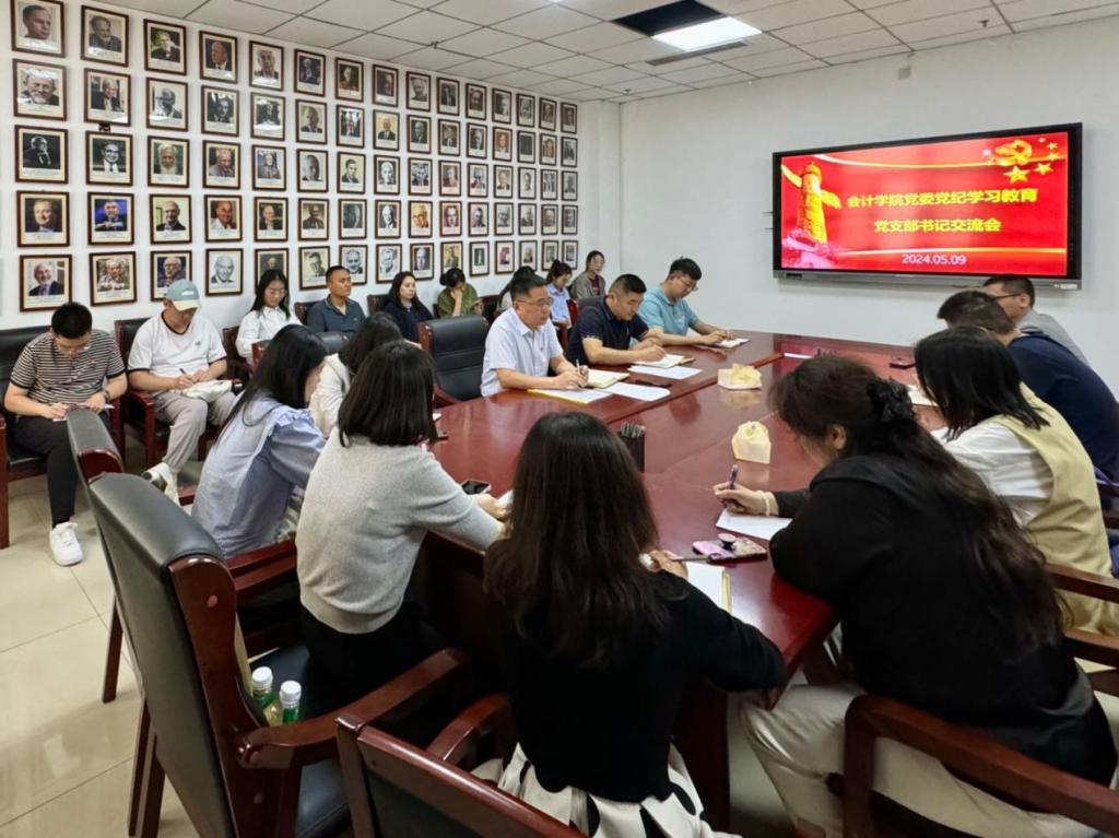 为进一步压实党建工作责任,提高党建工作质量,推动党纪学习教育走深走实,5月9日下午,国外足球预测网站 党委在逸夫楼309会议室召开党纪学习教育党支部书记交流会。会议由党委书记邵文涛主持,国外足球预测 党委委员和全体党支部书记参加。