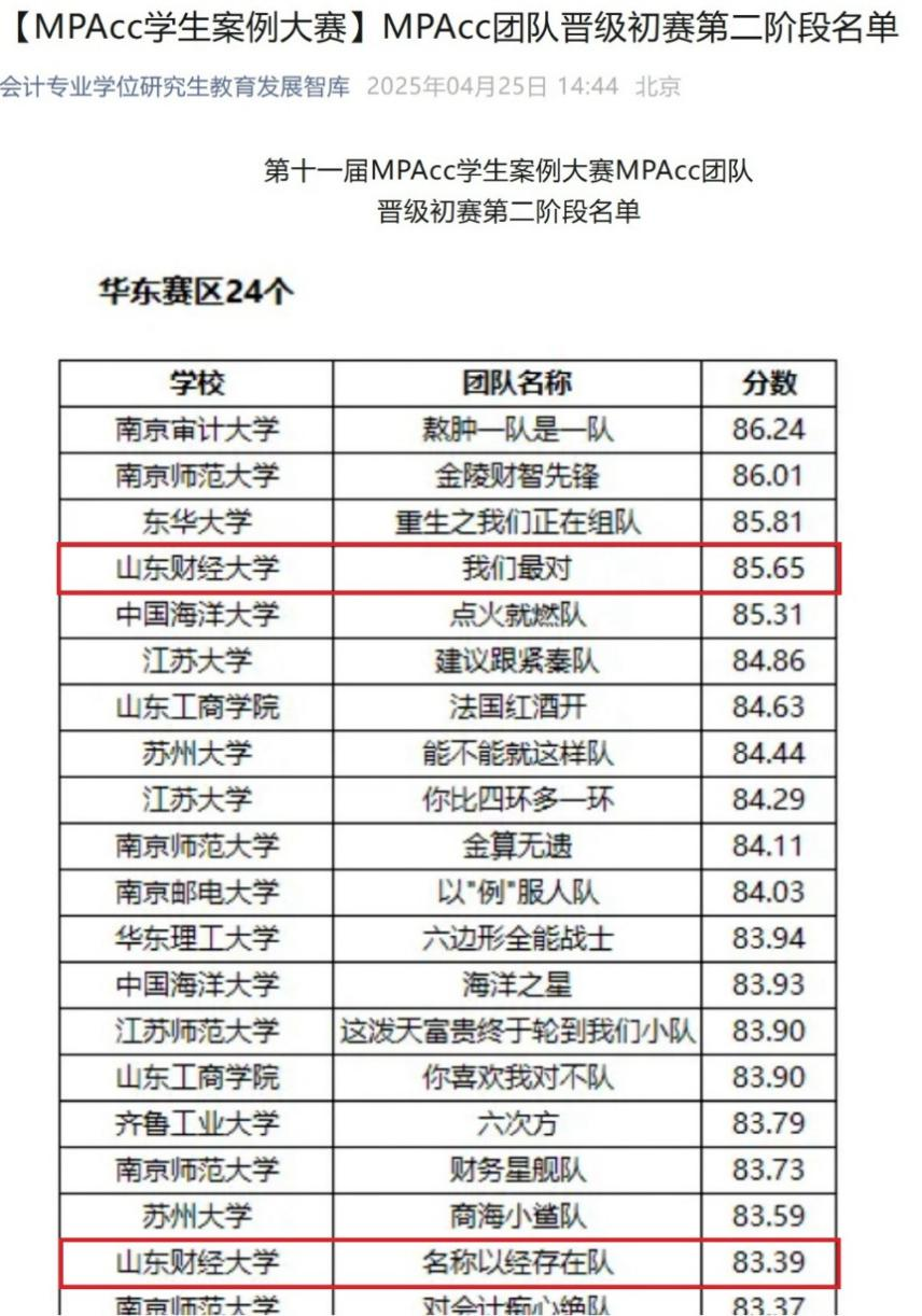 2025年第十一届全国MPAcc学生案例大赛第一阶段比赛于4月25日落下帷幕。经过激烈的角逐,我院在第一阶段中共有2支研究生团队从华东赛区541个报名团队中脱颖而出,获得佳绩。