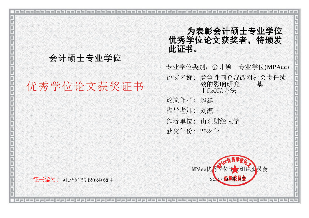 近日,全国会计专业学位研究生教育指导委员会公布了2024年会计硕士专业学位(MPAcc)优秀学位论文评选结果。由我院刘源老师指导,2022级会计硕士专业学位研究生赵鑫撰写的《竞争性国企混改对社会责任绩效的影响研究——基于fsQCA 方法》获评2024年会计硕士专业学位(MPAcc)优秀学位论文。