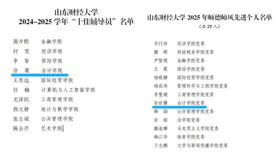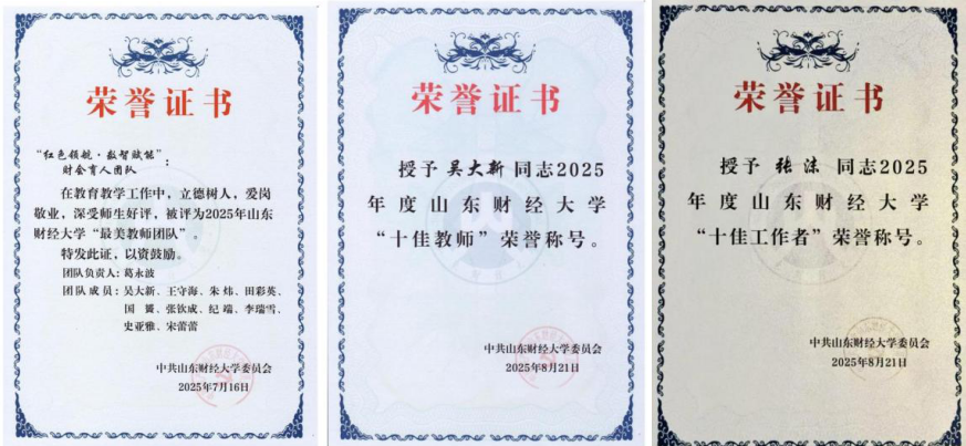 由国外足球预测网站 院长葛永波担任负责人的“红色领航·数智赋能”财会育人团队,成功入选山东财经大学2025年“最美教师(团队)”,吴大新获评2025年度“十佳教师”,张沫获评2025年度“十佳工作者”,孙菁获评2025年度“十佳辅导员”,孙世攀获评“师德师风先进个人”。