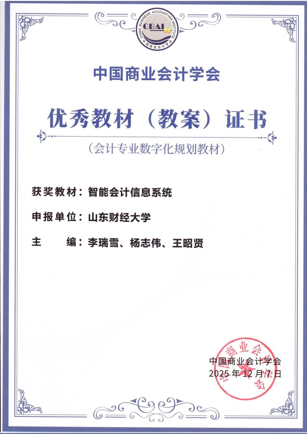 2025年12月5至7日,中国商业会计学会学术年会暨第三届会计教育教学高质量发展论坛于厦门市成功召开,会议期间,对会计专业数字化规划教材进行了表彰。经资格审查和专家评委综合评定,我院李瑞雪副教授主编的《智能会计信息系统》教材(教案)荣获优秀教材(教案)奖,全国共评出6本会计专业数字化规划优秀教材(教案)。