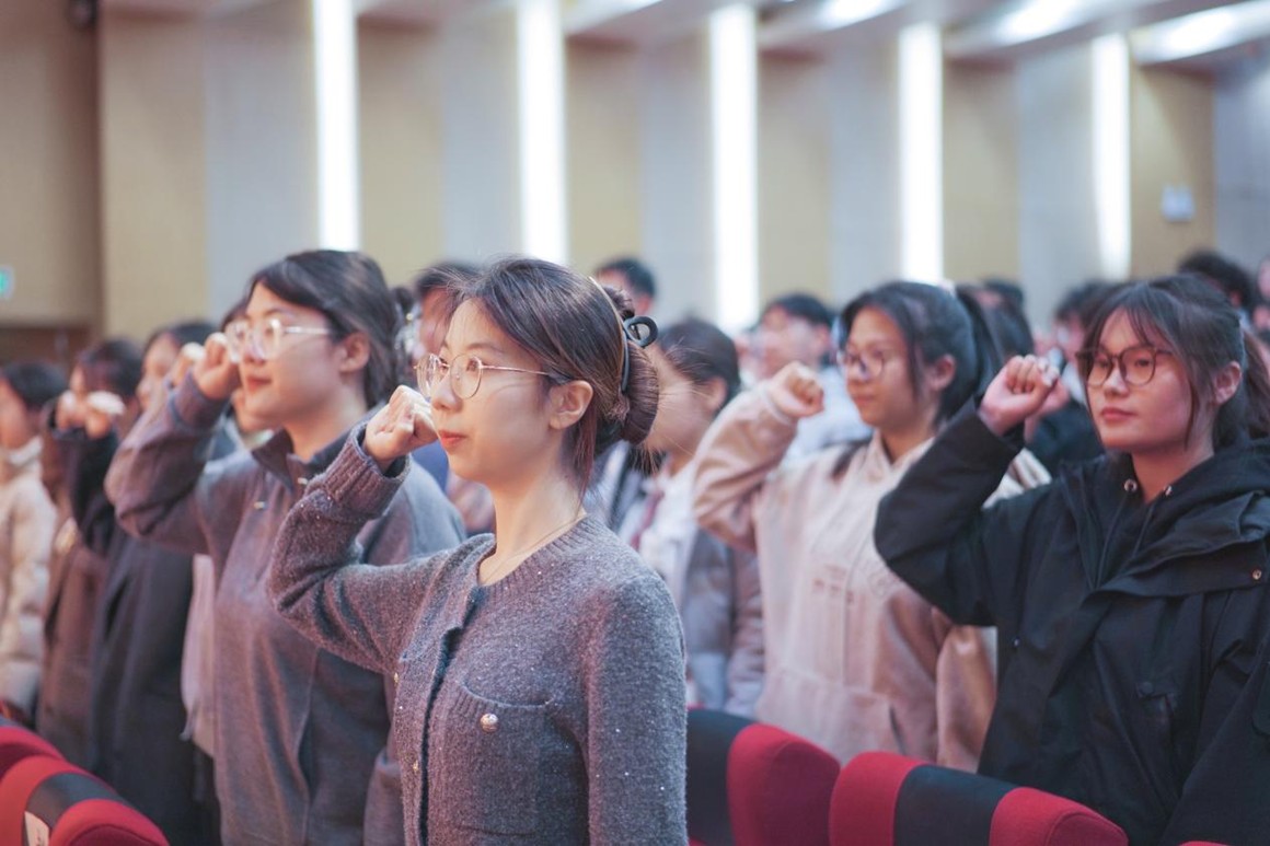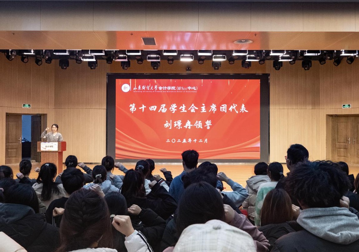 第十四届学生会主席团代表刘璟冉带领全体学生机构成员庄严宣誓。现场誓言铿锵,展现了新一届学生骨干的责任与担当。