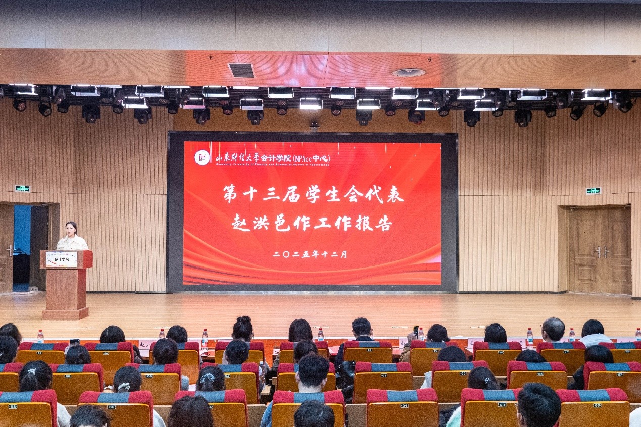 第十三届学生会代表赵洪邑作工作报告,系统总结了一年来学生机构在各项工作中的成绩与经验,并对新一届成员表达了祝福与期待。