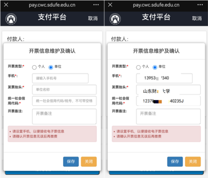 第三步,填写单位发票开发票信息并点击“保存”,包 括抬头、统一信用代码(税号)和发票备注(请与您所在单 位财务部门确认好再填写,如财务没有要求则不需填写,保 留空白)。请注意:此处手机号用来接收电子发票,系统缴 费完成会即刻自动开具发票,请您务必认真核对开票信息。