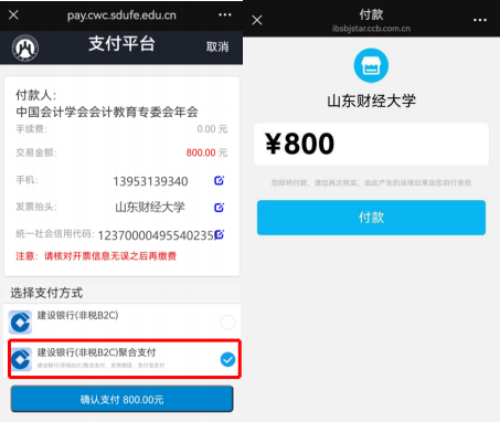 第四步,请您再次核对所输入的手机号(用于接收发票)、 单位抬头和单位统一社会信用代码填写无误后,点击“建设 银行(非税 B2C)聚合支付”,界面将跳转至微信或支付宝付 款界面,请您选择绑定在微信或支付宝的公务卡,完成支付。