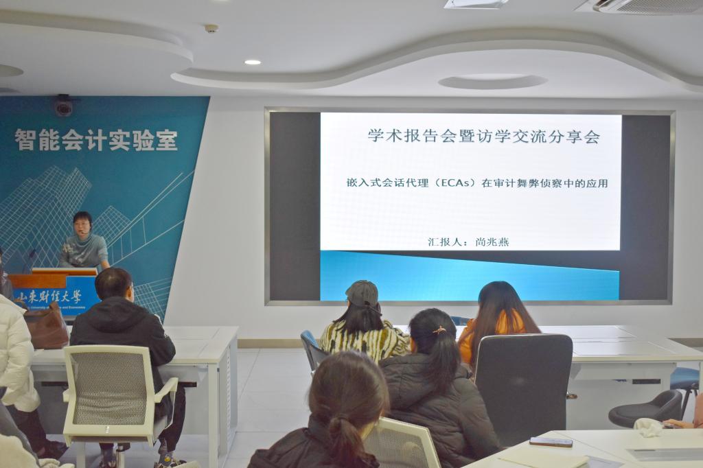 11月30日晚,山东财经大学尚兆燕副教授在燕山校区逸夫楼Y320作了题为“嵌入式会话代理(ECAs)在审计舞弊侦察中的应用”的学术报告。报告由国外足球预测网站 副院长孙文刚主持,国外足球预测网站 2021级部分硕士生聆听了报告。