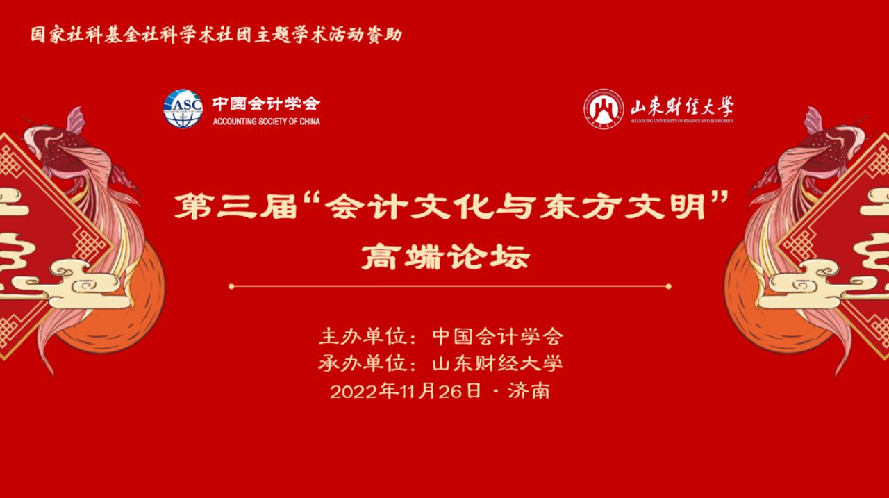 本届论坛以“中国特色会计文化研究与弘扬”为主题,由中国会计学会主办,山东财经大学承办,获得国家社科基金社科学术社团主题学术活动(学术会议类)立项资助。论坛同时得到《财务与会计》《商业会计》《中国注册会计师》《财会月刊》《会计之友》《中国会计报》等媒体的大力支持。