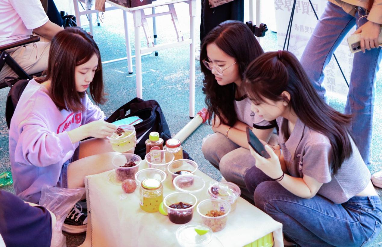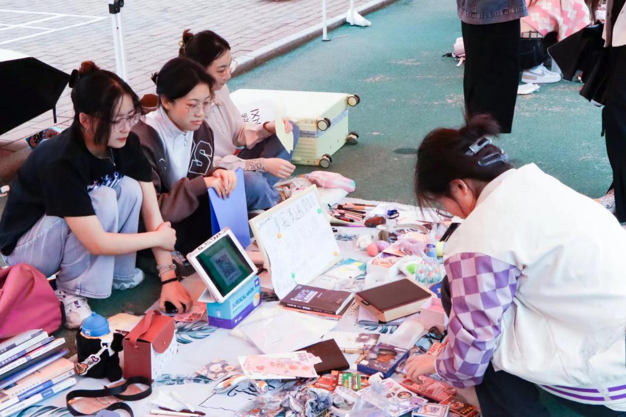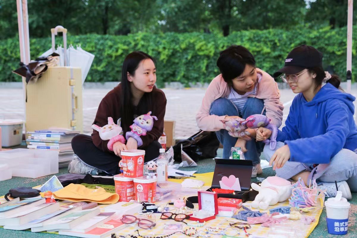 到了晚上,摊位纷纷点起小灯,深邃的黑夜中,灯光和同学们的热情点亮了跳蚤市场。