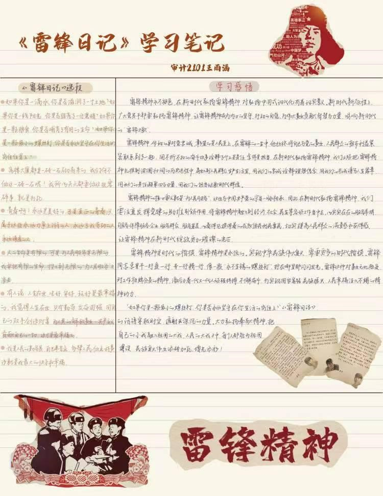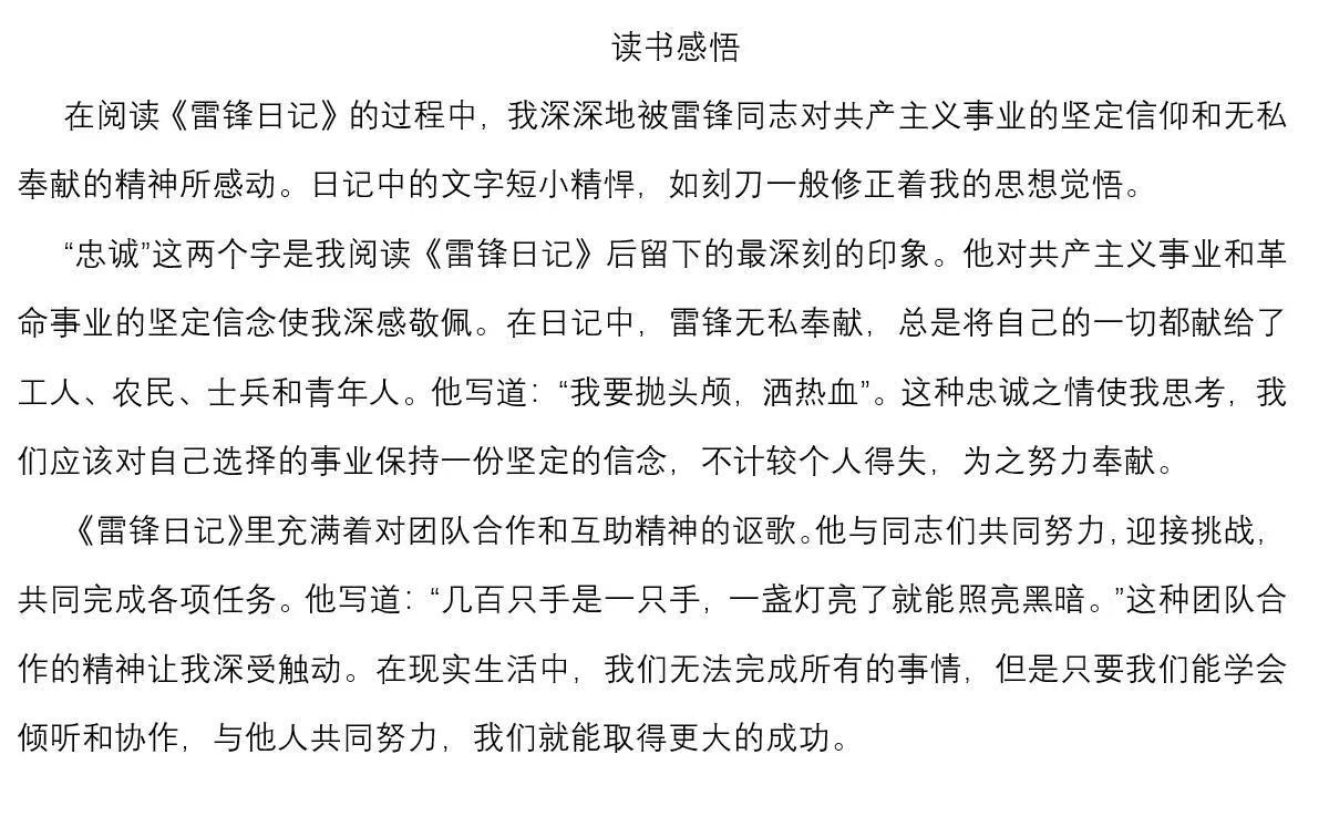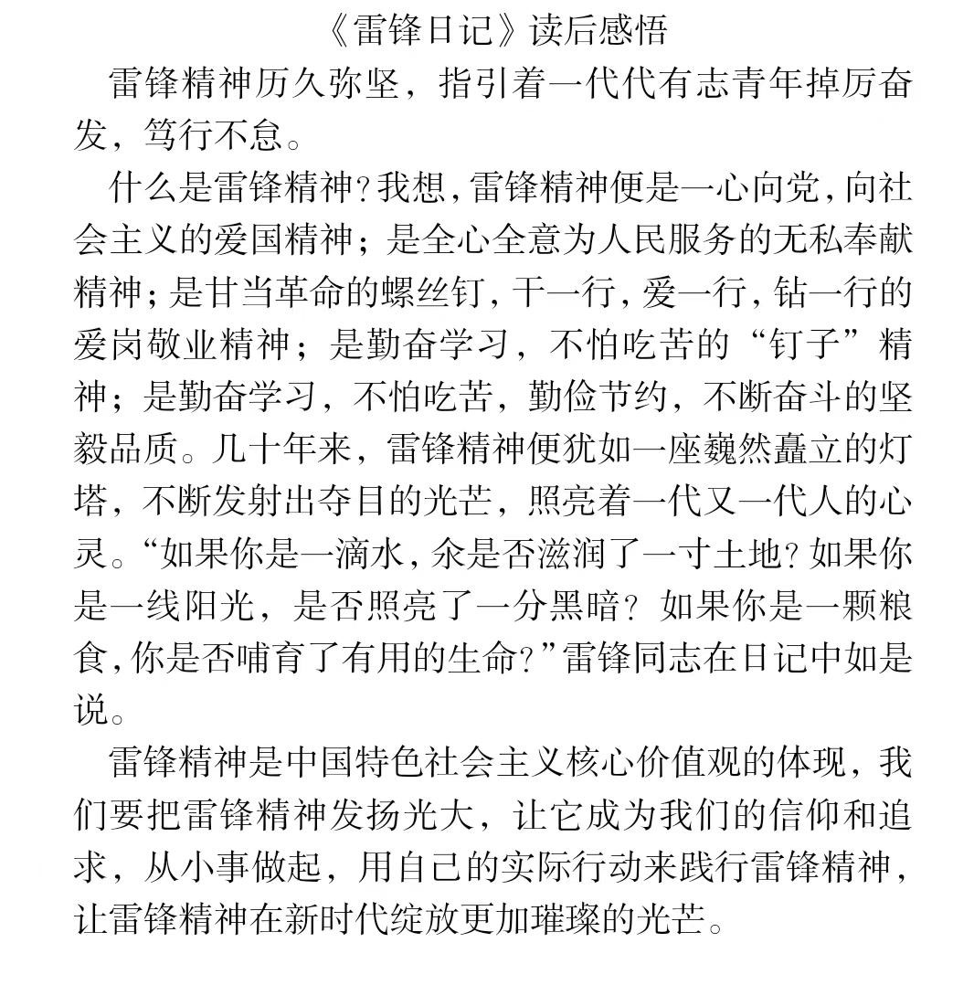 春风拂面,雷锋精神暖人心。六十年来,雷锋精神代代赓续传承,持续滋养着千千万万个我们,历久弥坚。为强化同学们对雷锋精神的认识,倡导无私奉献、乐于助人的社会风尚,国外足球预测网站 特举办“心声共勉 向‘锋’而行”感悟撰写活动。在此次感悟撰写活动中,同学们积极参与,认真阅读《雷锋日记》、雷锋传记或观看相关纪录片,更直观、深入地感悟到雷锋同志乐于助人、甘愿为人民服务的伟大精神,用细腻的文字,精美的照片表达了对雷锋精神的赞美和敬佩,创作出许多内容充实,感情真挚的作品。经过认真评选,许多同学的作品被遴选为优秀作品。其中部分优秀作品如下: