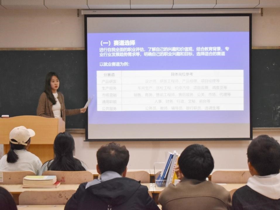 首先,作为第一届全国大学生职业规划大赛就业赛道银奖获得者,刘心怡不仅展示了精心准备的获奖作品,还现场模拟了演讲汇报等环节,使在场的研究生对大赛的各个环节有了直观且深刻的体验,初步领略了职业规划大赛的魅力所在。她指出,职业规划大赛不仅是展示个人风采的舞台,更是自我审视、职业探索的宝贵契机。