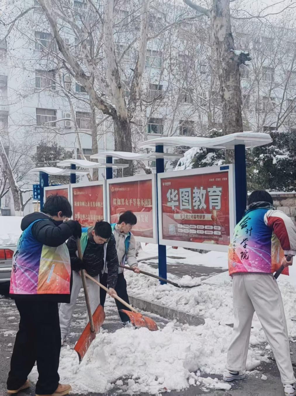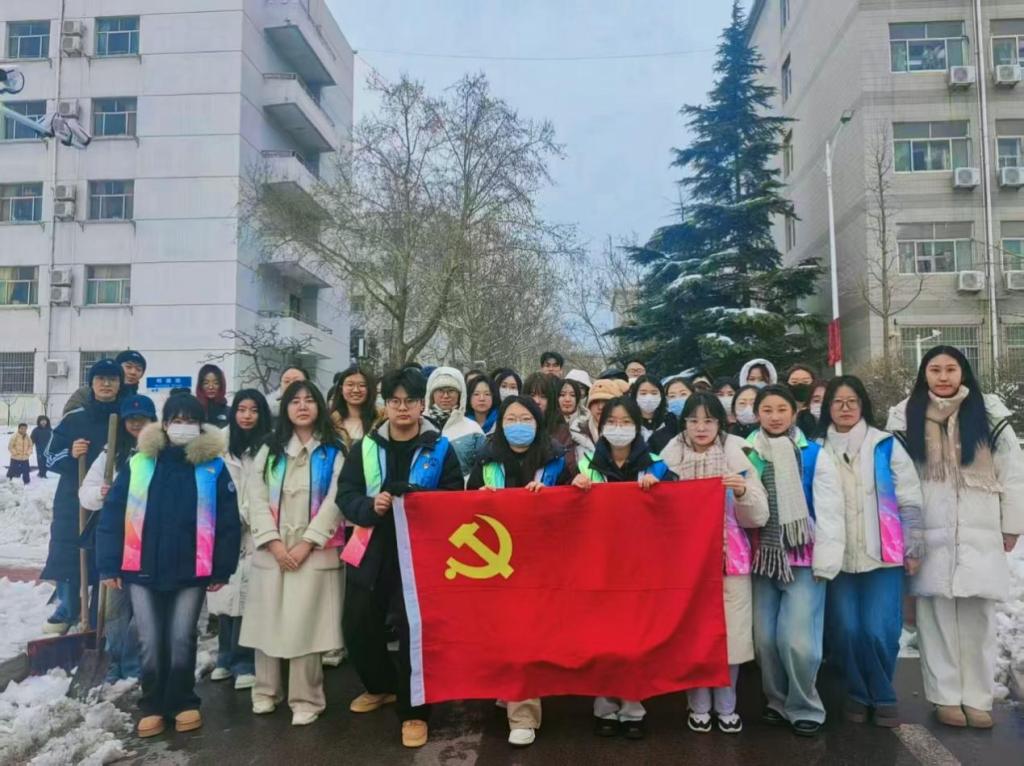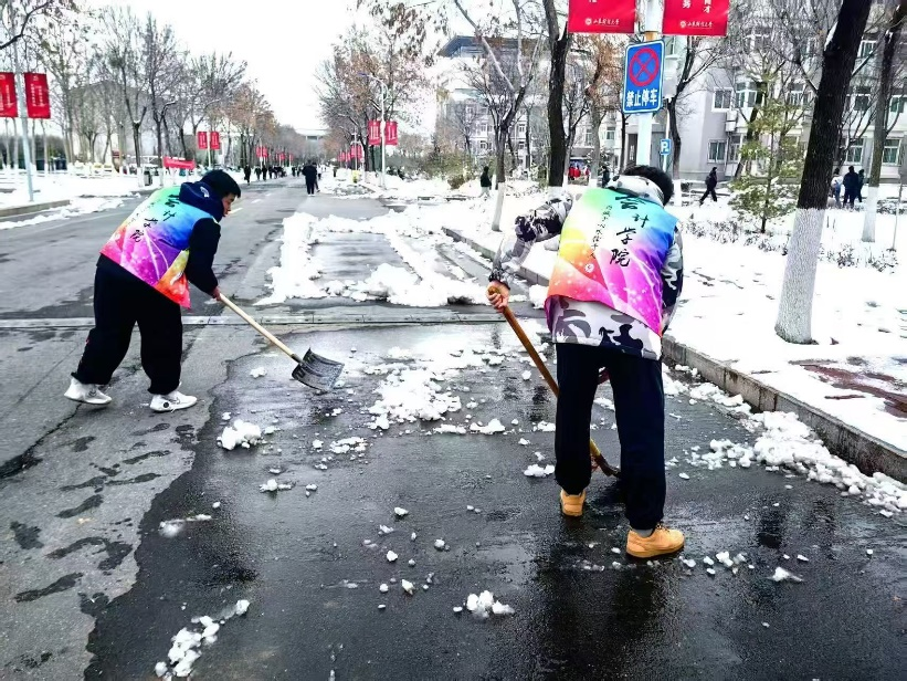 在燕山校区,预备党员和党员们率先垂范,身穿志愿者服装,手持清雪工具,分工协作,高效有序地开展清雪工作。带队老师翟子瑜现场指挥,统筹协调劳动任务,并提醒学生注意防寒保暖及劳动安全。尽管天气严寒,但预备党员和党员们以高度的责任感和使命感投入劳动,重点清理了1-4号宿舍楼附近等地方的积雪,确保学生出行安全畅通,以实际行动展现了先锋模范的引领作用,彰显了新时代学生党员的责任与担当。